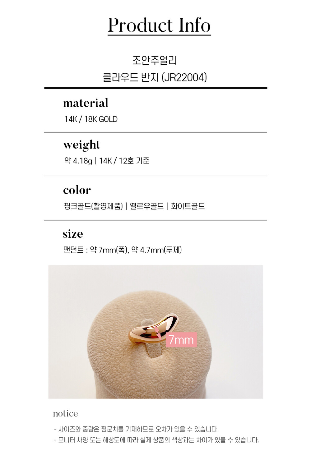 조안주얼리의 제품은 14k(58.5%), 18k(75%) 금 함량을 준수하여 제작되며