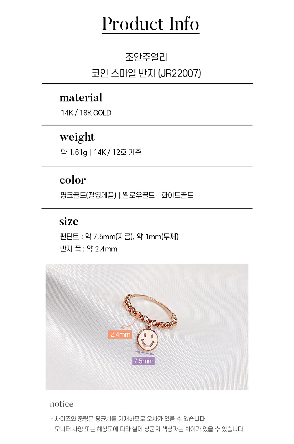 조안주얼리의 제품은 14k(58.5%), 18k(75%) 금 함량을 준수하여 제작되며