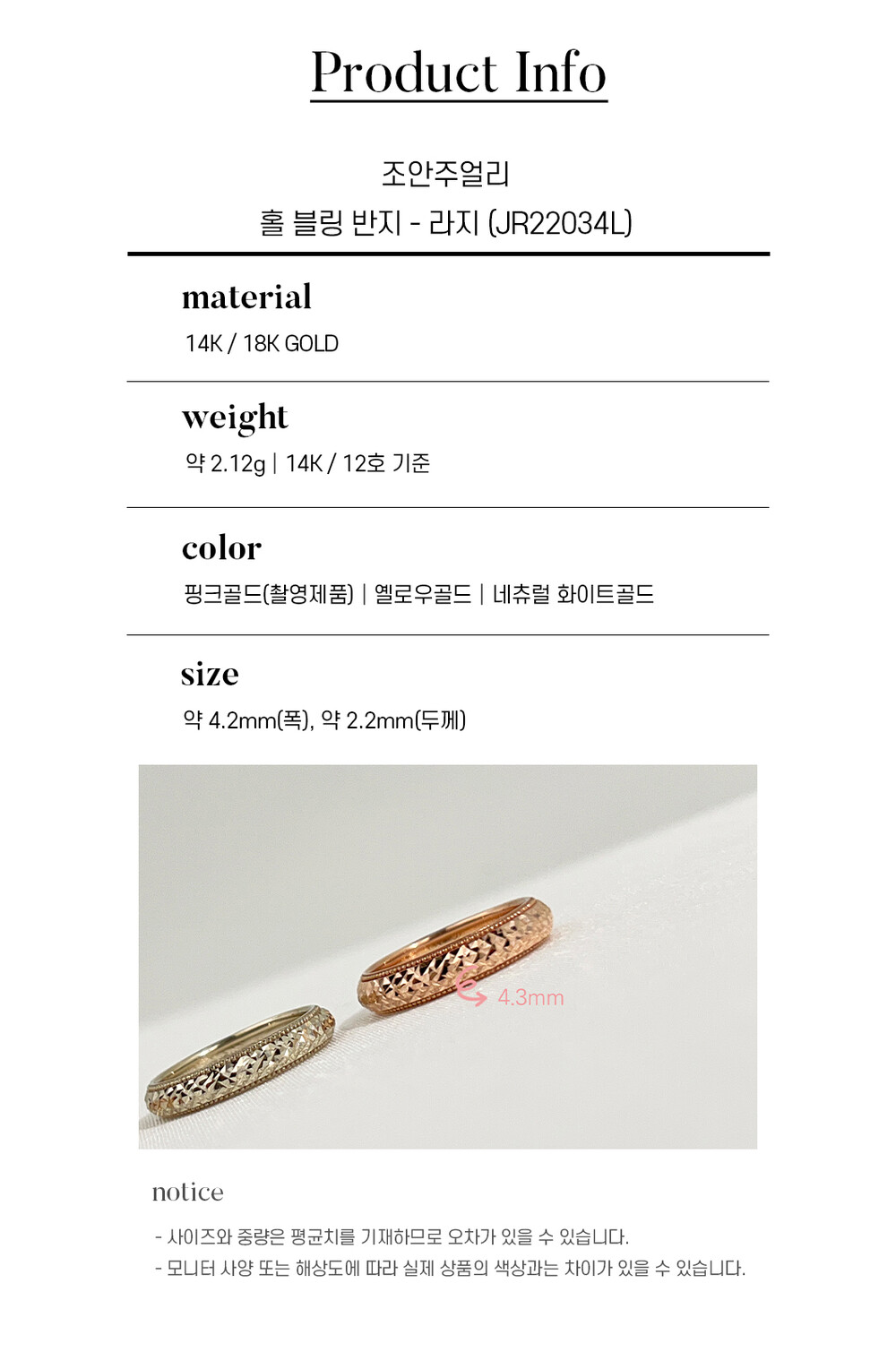 조안주얼리의 제품은 14k(58.5%), 18k(75%) 금 함량을 준수하여 제작되며